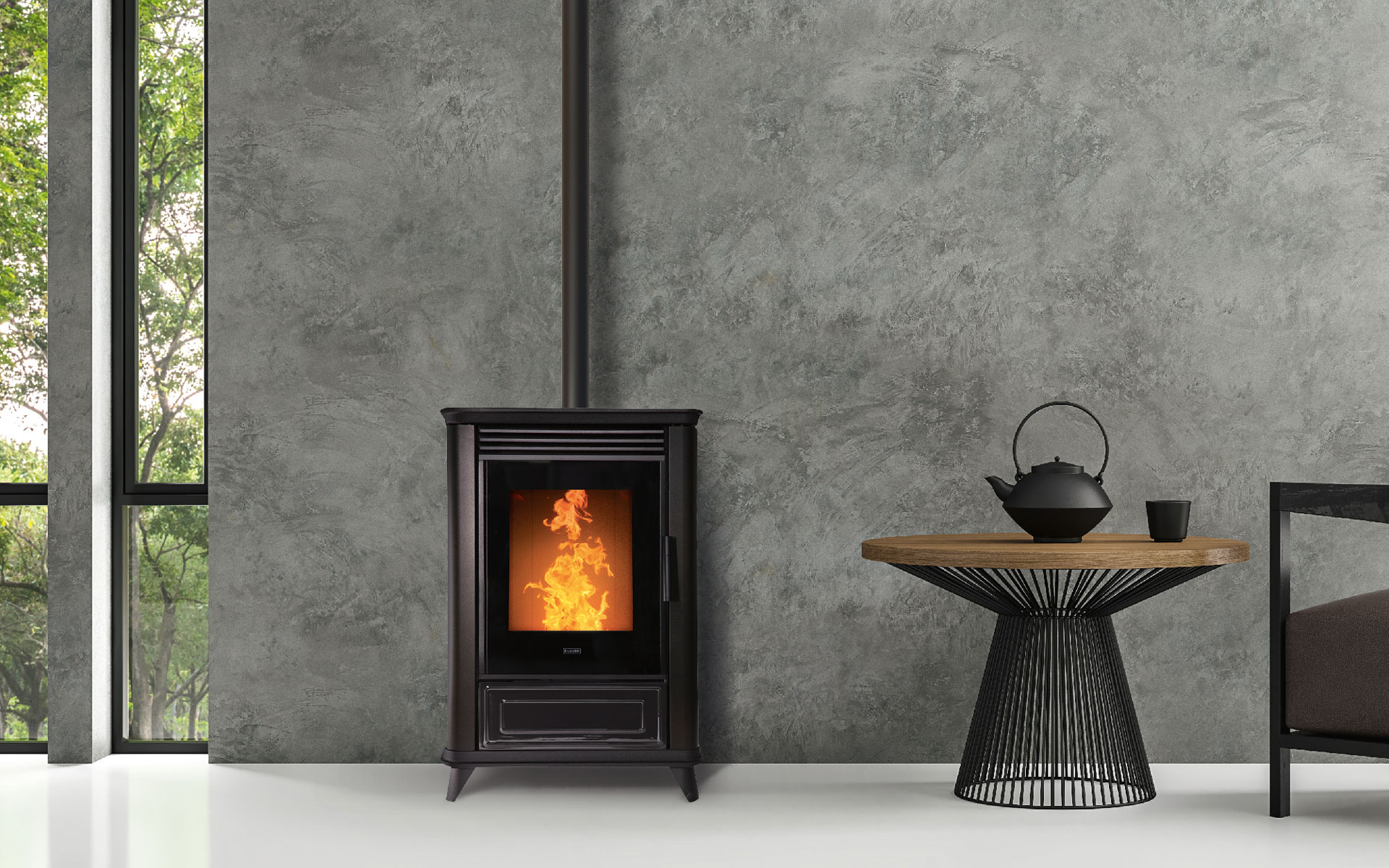 Stufa a pellet con frontale e top in ghisa. Coperchio serbatoio con apertura idraulica. Bruciatore autopulente. Sensori di sicurezza su porta e serbatoio. WiFi di serie.