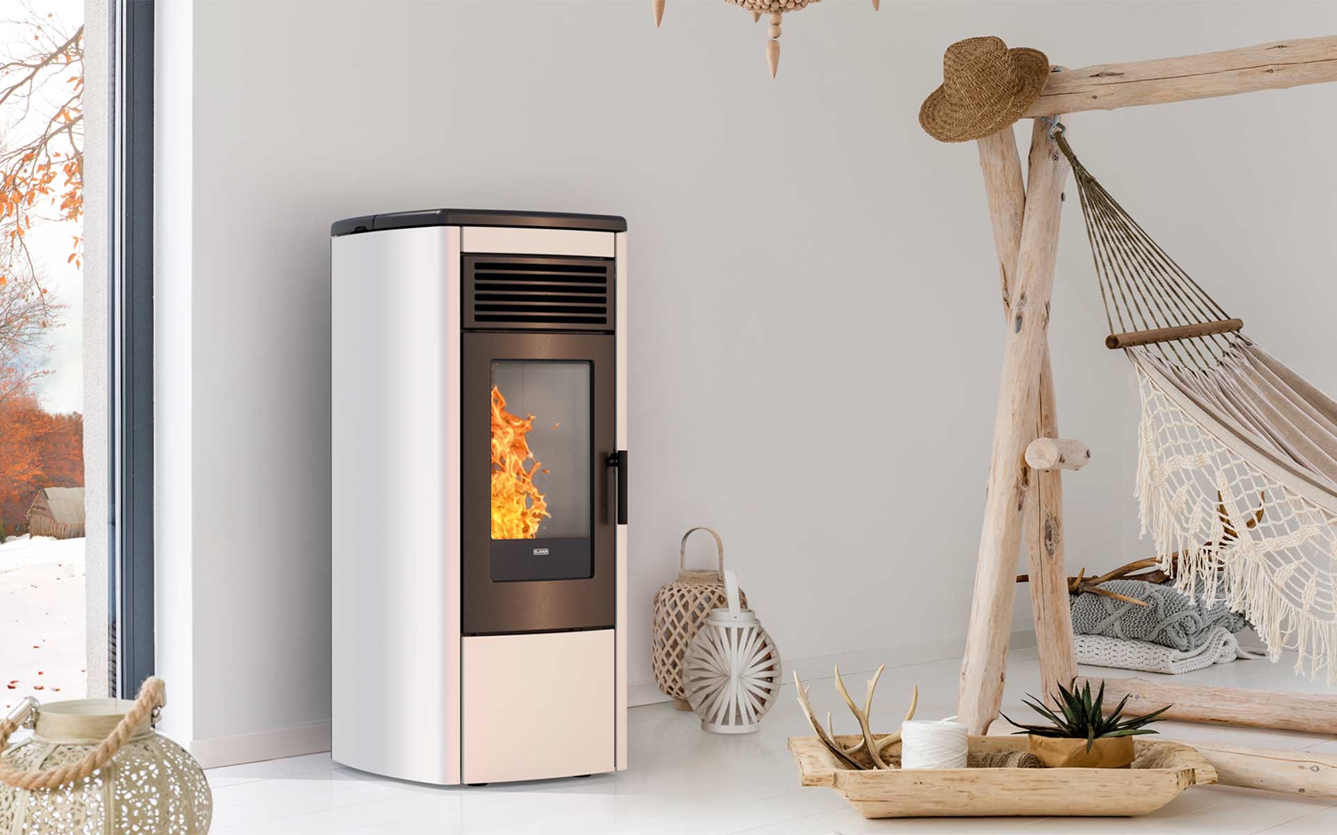 Stufa a pellet con frontale e top in ghisa. Coperchio serbatoio con apertura idraulica. Bruciatore autopulente. Sensori di sicurezza su porta e serbatoio. WiFi di serie.