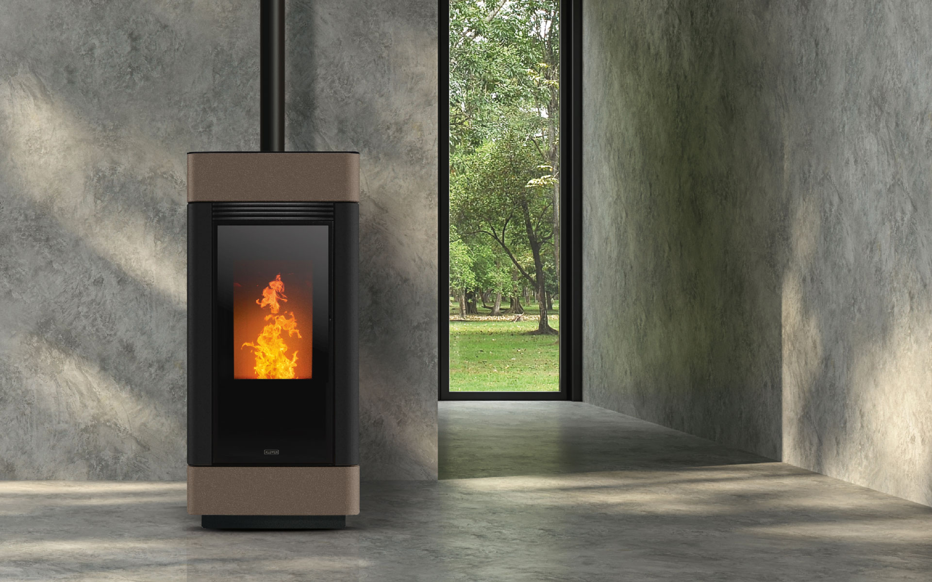 Stufa a pellet con frontale e top in ghisa. Coperchio serbatoio con apertura idraulica. Bruciatore autopulente. Sensori di sicurezza su porta e serbatoio. Pannellatura con sagomatura speciale. WiFi di serie.